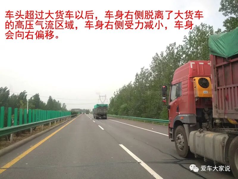 当你车头超过大货车车头的时候会明显感到车身向右晃动,这是因为超越大车的瞬间车身右侧离开了大车的高压区域,车身右侧气压突然降低导致的。