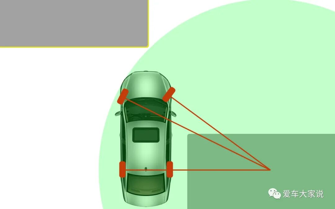 上图就是我们经常遇到的情况,从车位里开出来,总是怕蹭到前车。这时候我们就可以先判断一下前轮的位置,然后把方向盘打到底,在车头动起来的瞬间,你就可以根据车头摆动的趋势自动脑补出车头即将扫过的区域,只要前车在这个区域以外,那就是安全的。不过这个过程需要慢慢练习培养,多次尝试以后你对车头运动轨迹的把握就会更加精准。要注意的是一定要在车辆运动中去感受,因为只有你看着车头向一侧运动,你的大脑才会根据其运动特征去推算,一个完全静止的画面大脑也无法准确推算。就像你把方向盘随便转动几圈,老司机上车后如果车辆静止的话他也不知道你打了几圈,但只要车头一动,他立马就能判断出来。