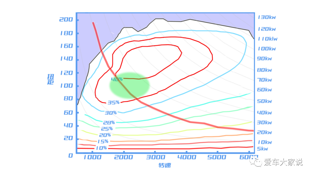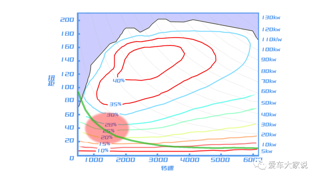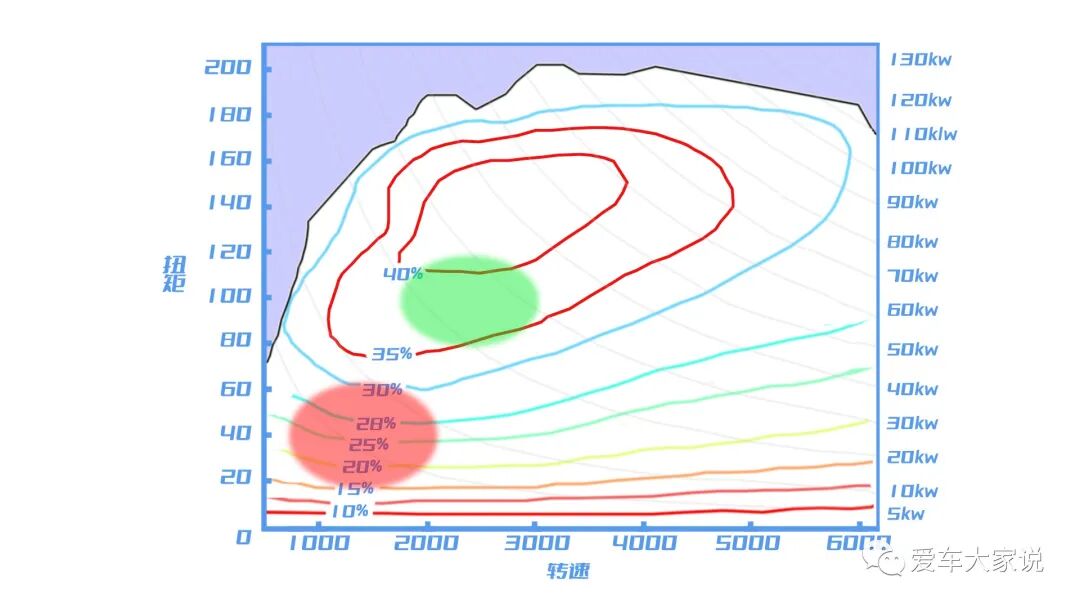 下面是个发动机的万有特性曲线图,缓踩油门起步时发动机可能工作在偏左下角的红色区域,热效率偏低。而大脚踩油门时发动机则工作在更靠近 右上角的绿色区域,很明显热效率更高。