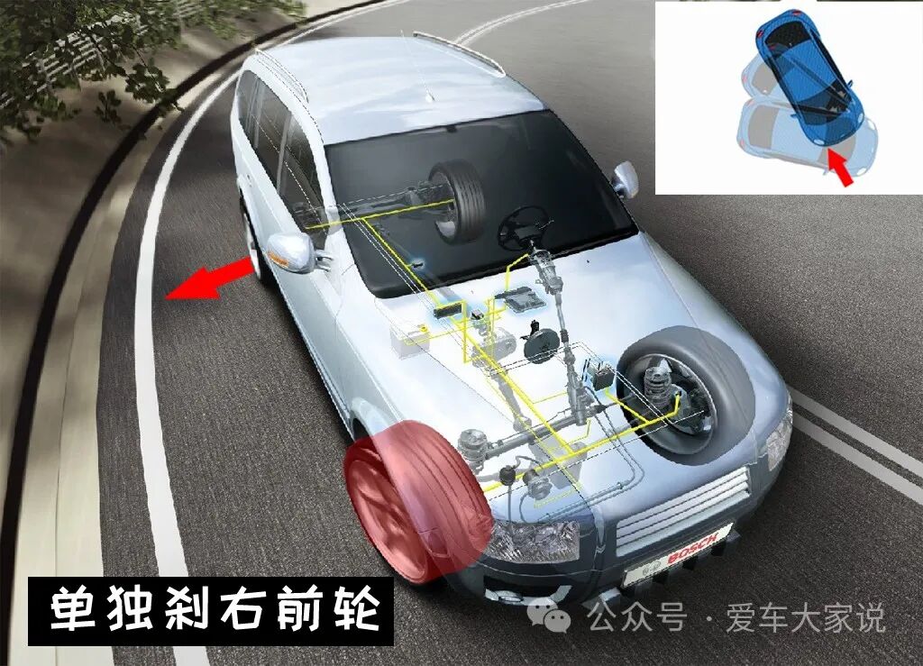 ESP的工作原理其实可以用一句话来概括:转向不足刹内侧后轮,转向过度刹外侧前轮。