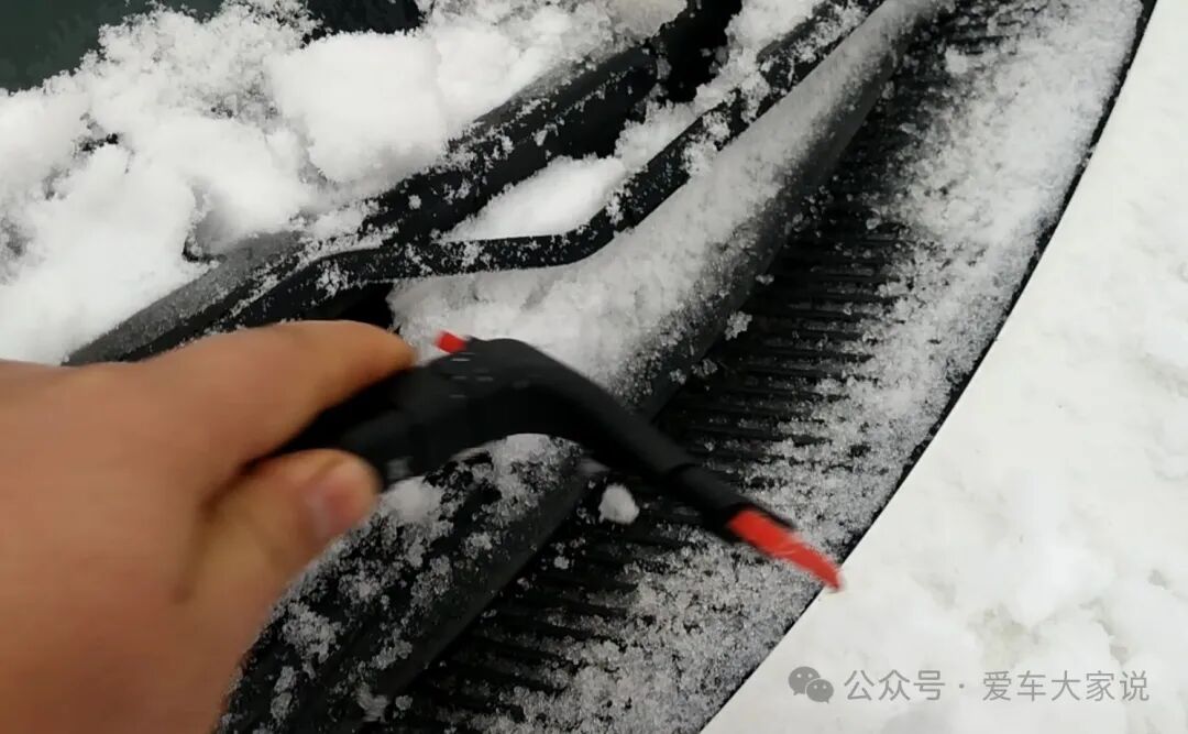 下雪天汽车被积雪覆盖,很多车主都会把车窗和挡风玻璃上的积雪清理掉后就开车出发了。其实你忽略了很重要的一点,那就是挡风玻璃与发动机盖交汇处的积雪。