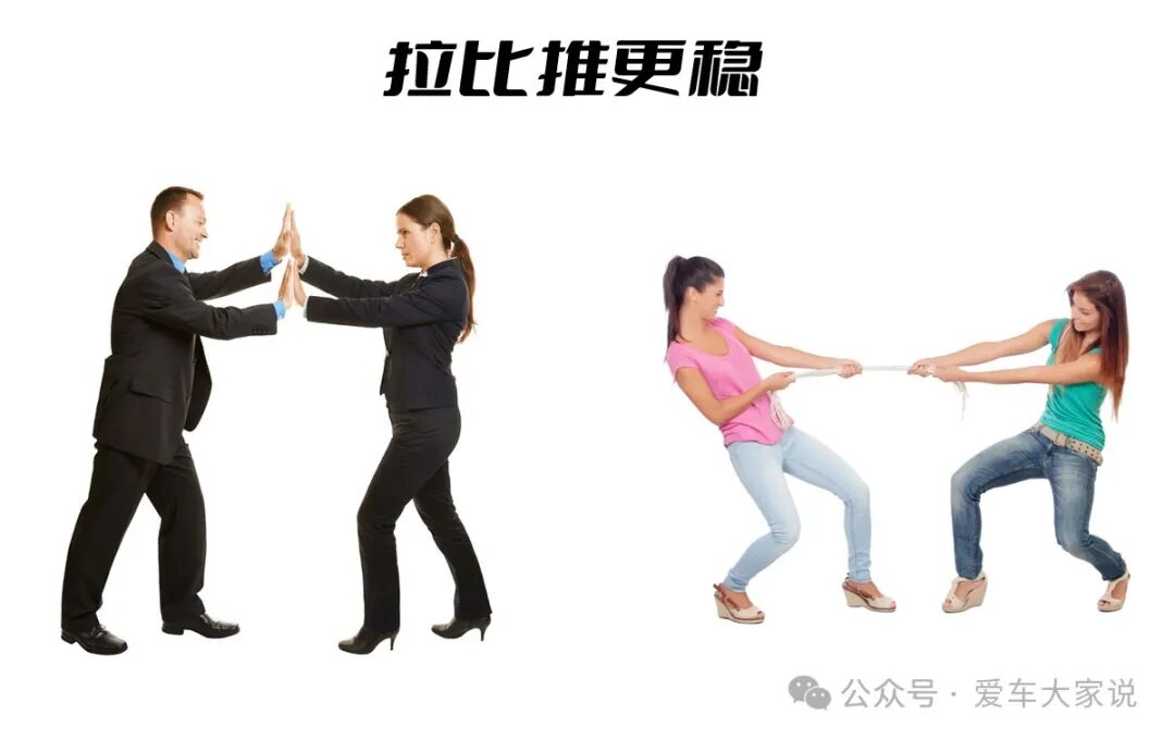 但是两个人手掌对在一起用力推的话就没那么稳了,只要用力大一点,胳膊就很容易往两边偏。前驱和后驱也是一样的道理。