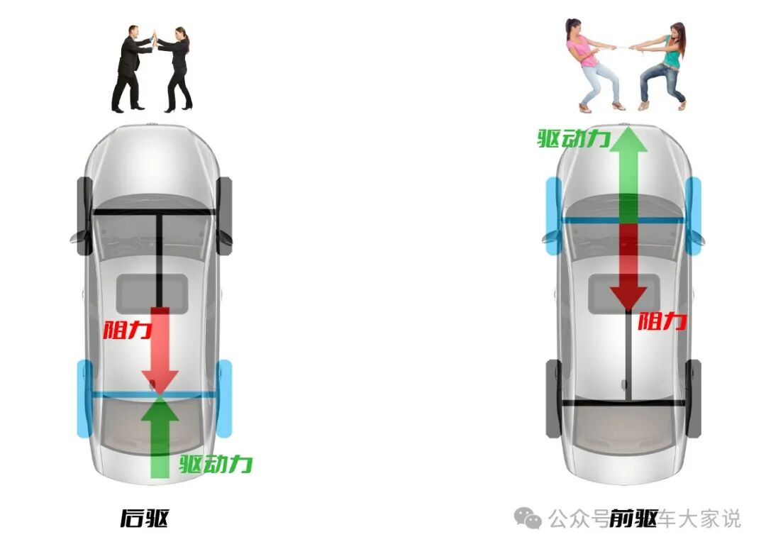 前驱车驱动力由前轴发出,方向向前。而前轴受到车身的阻力向后,就像两个人手拉手往两边用力一样,合力方向很稳定。