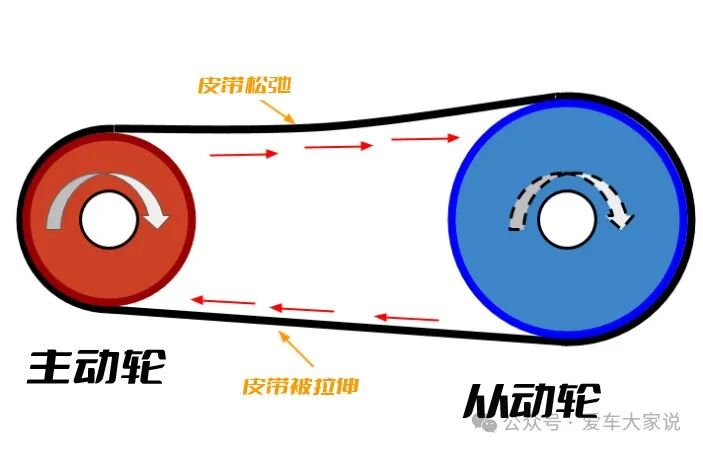 在传动时与主动皮带轮接近的那一侧皮带承受拉力,会被拉伸。而脱离主动轮的那一侧皮带则相对松弛,这样在传动扭矩改变或者转速改变的时候松弛的那一侧皮带就很容易抖动。
