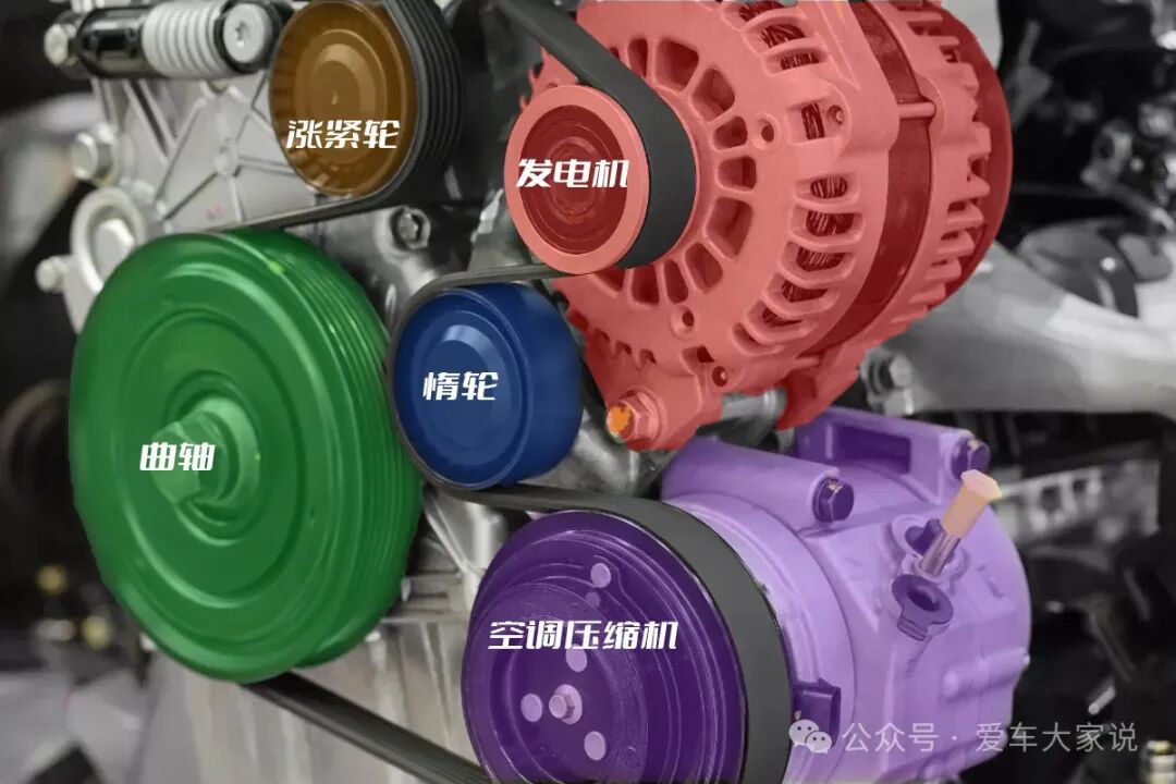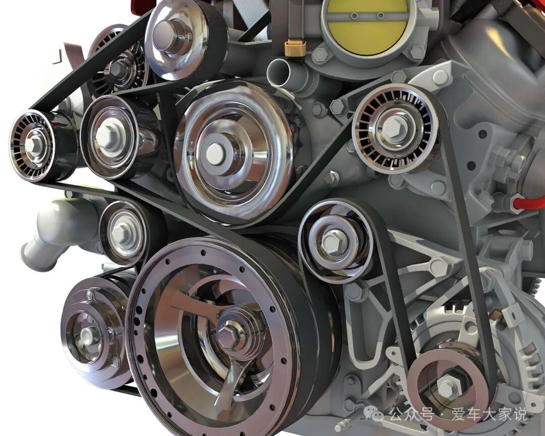 发动机上有各种附属设备,比如冷却水泵、发电机、空调压缩机、转向助力泵等。它们都通过皮带由曲轴皮带轮驱动。