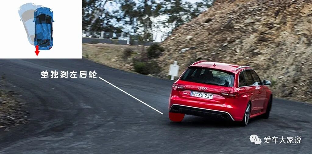 这就是ESP的原理,通过各种传感器去监测车辆动态,当汽车即将发生失控的时候通过对个别车轮进行单独制动从而改变车身的受力,帮助稳定车身姿态。