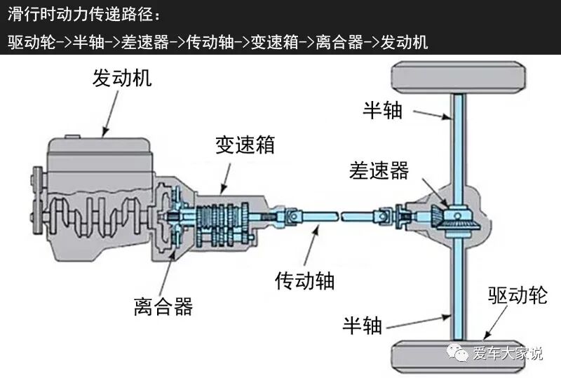 我们举个例子或许能帮助大家理解:手动挡车电瓶亏电的时候可以推车启动,原理就是推车的时候用驱动轮反拖发动机转动,然后喷油嘴喷油、火花塞点火,发动机就可以启动了。而行驶中松开油门滑行也是一样的道理,驱动轮反拖发动机转动,只是此时喷油嘴不喷油而已。