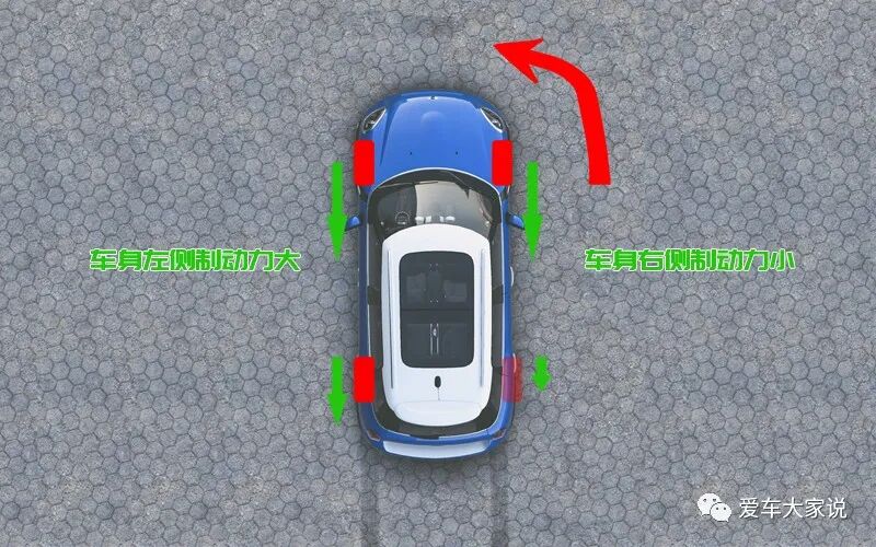 其实原理很简单。因为踩刹车时车身由于惯性会继续往前冲,而车轮与地面摩擦对车身产生阻力,拉住车身使其减速。正常情况下车身左右两侧车轮产生的制动阻力是一样大的,这样汽车就能平稳减速。但是爆胎后爆掉的那个车轮无法提供足够的制动力,就会导致爆胎这一侧的车身受到的制动阻力降低,这一侧车身向前运动的速度就更快了。