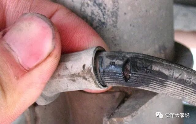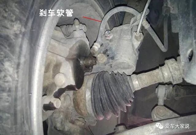 而最应该检查的是通往车轮的那段刹车软管。因为汽车在行驶中车轮要上下跳动,所以通往车轮的那段刹车管就只能用橡胶材质的,不怕弯折。但橡胶会老化,而且行驶中车轮反复跳动,刹车软管也要被反复弯折,时间久了就可能导致刹车软管老化开裂,从而影响刹车安全。