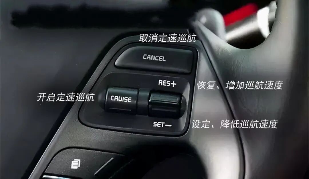 而RES按键也就是“恢复键”,功能有两个,一个是如果因为拥堵临时取消定速巡航,但没过多会道路又畅通了,这个时候按下RES按键,就会变成之前设定好的速度继续匀速行驶。第二个功能也很重要,当以某个车速比如90千米每小时巡航时,觉得速度有些慢,毕竟在高速上,这个时候要加速的话就可以按下RES按键。其实,RES按键旁边一般都有“+”号,也就是加速的意思。