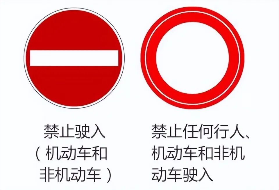 第1组比较难辨认的交通标志,是禁止通行和禁止车辆驶入。这组标志出现的地方还是比较多的,而且即便是老司机,也不一定能准确区分开。两者外形非常相似,主体都是圆形的,但是禁止通行整体看起来像个圆环,而禁止车辆驶入是横向的长方形,内部是白色的。此外,禁止车辆驶入指的是机动车不能驶入该区域,因此会设置在在步行街或者人流较大的地方。而禁止通行表示,不仅是机动车,行人和非机动车都不准进入。