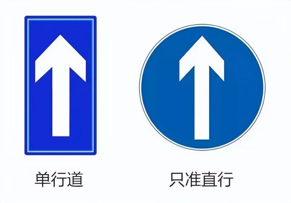 第2组是直行和单行线,这组标志也很容易弄混淆。首先从外形上看,直行这个标志主体是圆形的,而单行线是长方形,里面有方向朝前的白色箭头。而在意思方面,两者自然也是不太一样。单行线指的是,在该路段上只能按照一个方向行驶,一般会设置在单行路的路口。而直行这个标志,表示在该路段内只能直行不能左转或右转,但可以是方向相反的双向车道。