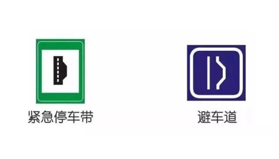 第3组标志是紧急停车带和避车道。这组标志区分的时候主要看颜色,避车道标志整体是蓝色的,表示单车道上车辆可以在此交错避让,所以会在一侧特意进行加宽。而紧急停车带,主体是绿色的,这个和绿色通道有异曲同工之处,一般会出现在下高速的地方,用途是给那些抛锚的车临时停车用。