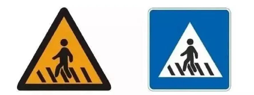 第4组标志是注意行人和人行横道,这组标志区分的话也是有一定难度。首先,两者在颜色上有所差异,人行横道整体是蓝色的,而且是正方形,注意行人是黄色的三角形。不仅如此,两者所表达的意思也不太相同,人行横道这个标志是提醒车主们前方是斑马线,注意提前减速避让。而注意行人,表示前方经常会有行人走动,而且路况复杂,往往会出现在学校医院附近。看到这个标志,车主们的第一反应,同样是要减速慢行。对此,你们有什么看法呢?