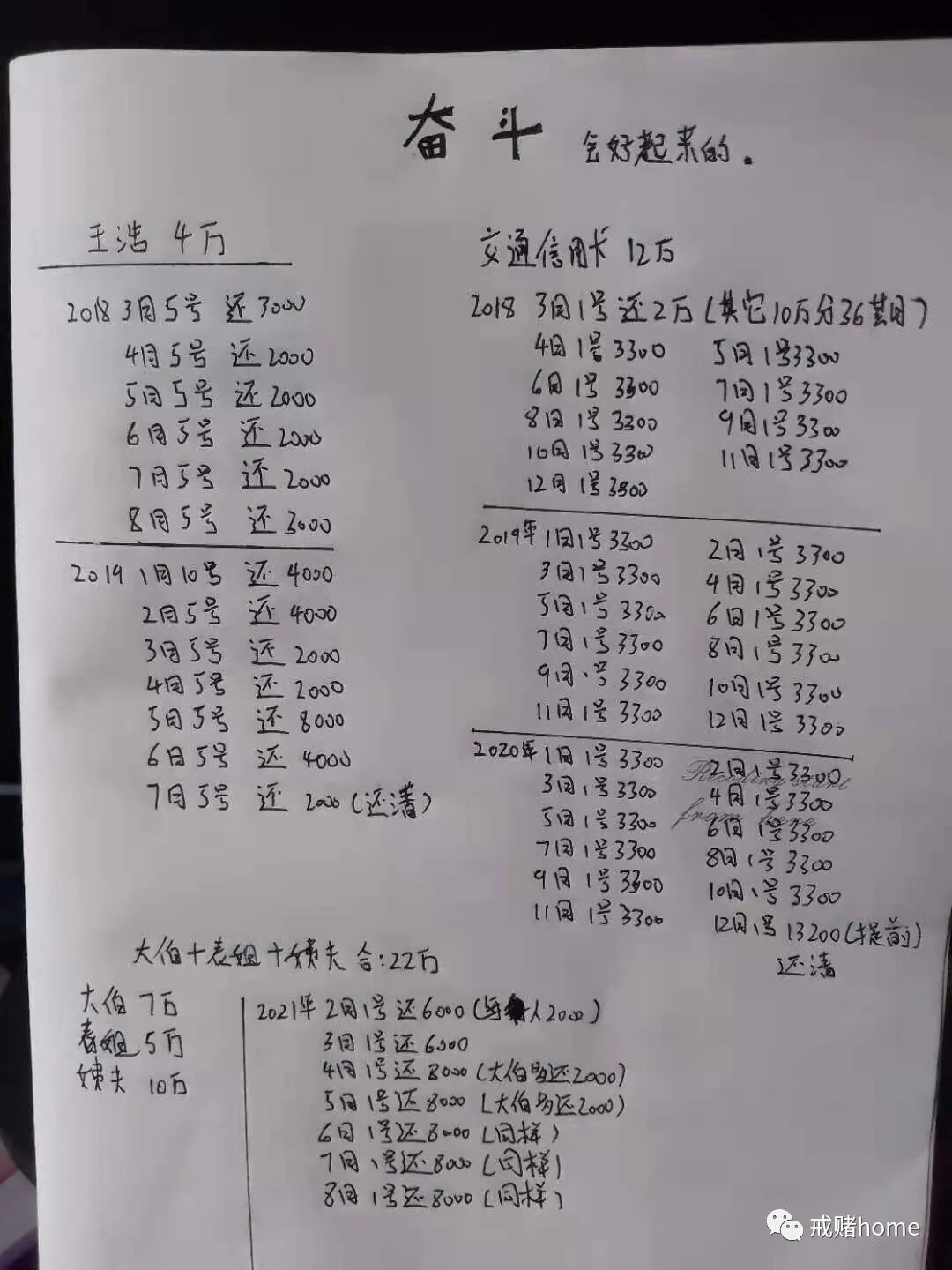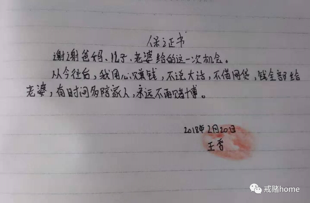 早些年接触网赌,差点把小命都搭上,我坦白了一共两次,第一次18万,全家人筹款帮我还清,第二次好了伤疤忘了疼,又负债36万,这次家人已经没有任何能力替我还款了,老婆也被逼的想自杀,在所有的亲戚商量之下,还是决定给我一次机会,我也写下了人生当中最后一个保证书,以获取家人,老婆的原谅。从2018年2月20号到今天,差不多有两年半的时间了,36万还剩下16万左右,差不多还需要个一年半载的几乎就还清了!