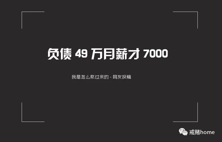 49万赌债我先说说自己是怎么借的吧,我自己的网贷+信用卡总和27万,亲戚那边12万,好朋友的信用卡我借了10万,我父母只知道我欠19万,不敢坦白,坦白了他们接受不了。刚开始那会,光自己的网贷+信用卡就要还1.6万,朋友信用卡分期每个月还1.4万,也就是月月都要还3万,除了工资7000,我几乎没有任何收入,吃家里的,睡家里的,电话费都是家里绑定的宽带,不抽烟,也不喝酒,生活开支是0,这7000能全部省下的,这就是我当时的现状。