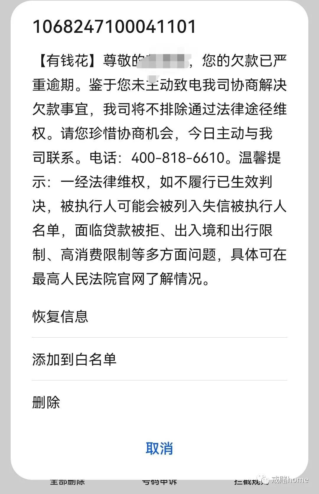 手机无时无刻都被狂轰乱炸,这都我以前造的孽,现在七十多万的债务,想想都后悔了,这也让我看明白了,真的不能继续赌了,博主说的对极了,债嘛,死不掉人的,我要再赌,就不是人了,就是个鬼了。还有个小孩要养,我还有个家庭要照顾,我不能颓废了,债务就让他去,大不了就把我抓起来,判刑吧,又死不掉人,反正现在就是打死我,也不会再赌了,有钱,我回家加点餐,给小孩买几件衣服,给爸妈买营养品也是好的。