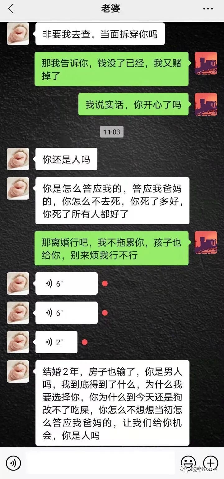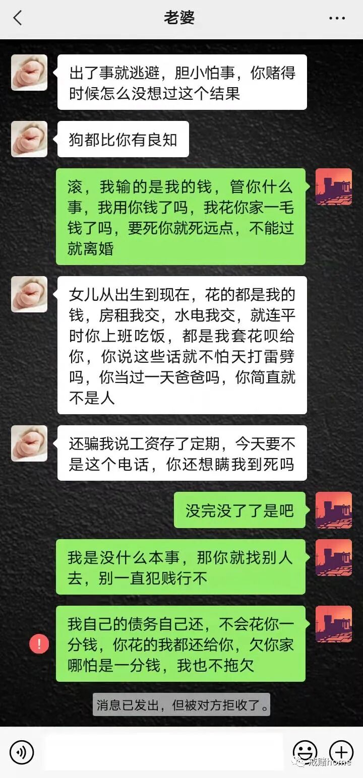 对老婆说的那些歹毒的话,并不是我想这么说,我只是觉得自己没有救了,想快点让她对我死心,别把时间浪费在一个赌鬼的身上。我的心跟死了一样,有点钱都想翻本,不顾家,女儿一岁我都很少抱过,我相信大部分赌徒,遇到这类事情,估计都很难控制情绪吧。今天这个谎言被拆穿了,是实在隐瞒不下去了,也好,她知道了也好,早点离开我这个赌鬼,也算是个解脱。