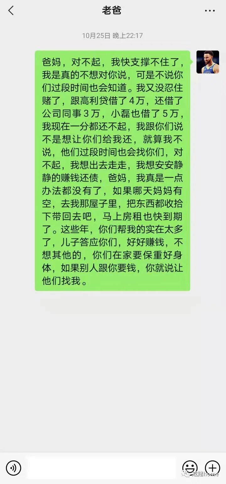 临走的时候,发了个告别信息给父母,到今天父母都没有回复一句,这次我真的彻彻底底把他们给伤到了,或许,现在的我就算在外死掉了,也无人在意。一个赌徒能沦落到这种地步,完完全全是自找的,没人逼着我赌,也没人逼着我去借钱,我越来越理解可怜之人必有可恨之处这句话了。