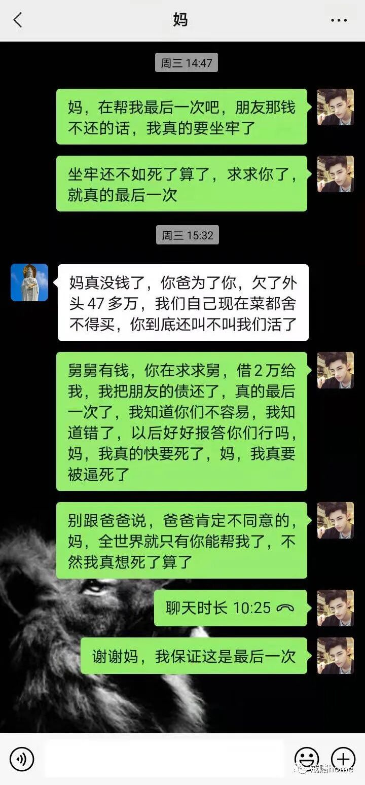成为了一个赌徒,说谎话的本领就像天才一样,知道家人没钱,我就变着法的让我妈去找有钱的舅舅借钱,其实每个赌徒都知道家人的弱点,我爸对我比较狠心,所以一般我都不会找我爸,我知道我妈关心我,疼我,我就一直想方设法的从我妈那弄钱,因为我有足够的把握可以骗到。不知道多少次了,我爸不同意,我妈硬是逼着我爸去替我借钱,借不到钱就会吵架,她在意我这个儿子,所以我爸现在估计跟我一样,也是生不如死。有时候,我真的是控制不住自己,一输钱,我就想着赢回来,没本金,哪怕我妈身上就剩下200块,我都要搜刮过来,一把输掉,从来不考虑爸爸妈妈还有没有钱吃饭买菜,这就是一个天理不容,应该天打雷劈的我,现在醒了,不过也晚了。