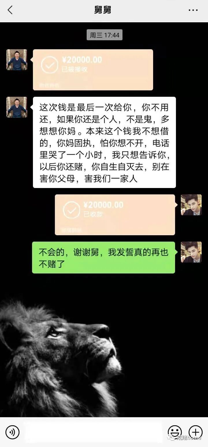 舅舅的两万块,我其实最高赢到了3.9万,如果当时提出来全给我妈,再也不赌了,起码家里还能好受点,可是当时的我头脑发热,赢了还想赢,就是停不下来,脑子里无限幻想,就像是发了疯一样。最后输完也就差不多十来分钟,一把都没赢,知道结果肯定输光光,一样控制不住,那时候不管全家人死过,只为了满足自己那一点点的私欲,一意孤行。现在的我恨透了自己,我知道就算那次赢了,也提现了,终究还是输进去,因为博主说的对,全世界根本就没有哪个赌徒在赢钱的时候撤退,包括我,我太了解自己了,只要我输了,毫无底线,能借的都借,哪怕你借我一万,利息4万,我也愿意,根本不会考虑能不能还的起,更不会考虑家人的痛心感受。