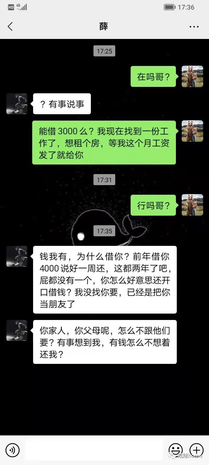 几乎微信里的熟人,能借的都借了,借不到了,这次真的借不到了,我只是差个房租钱,到处求人,求了一天了,却没人相信了。昔日关系最好的朋友,我开口借钱,也被他泼了冷水,他说的对,我连欠款都没还,我哪来的资格去找他借,可他不知道,我除了他,已经没有任何人愿意帮我了,我的一切,都是因为网赌,变的一文不值,家没了,老婆没了,父母也因为帮我,债台高筑,我就是狼来了故事中的那个小孩,谎话说多了,这次说真话了,却没有任何人愿意相信了,也没有任何人肯给我机会了。今天的下场,都是往日的赌造成的,大钱也借,小钱也借,今天翻着以前的聊天记录,我自己都不敢相信,为了借钱,今天说这个理由,明天说那个理由,偶尔赢钱了,我都舍不得拿去还账,真的碰到事需要钱了,发现身边真心的朋友,亲戚,家人都远离了,我真的后悔,可再怎么后悔,我失去的东西也回不来了。