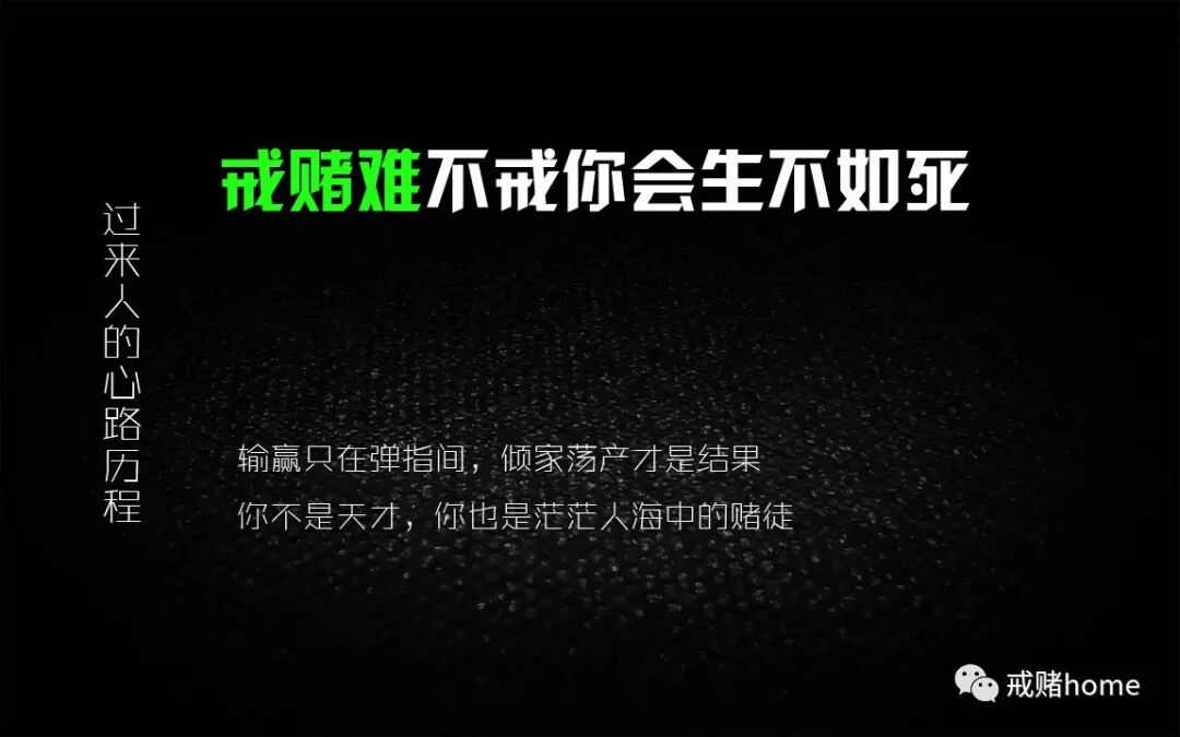 博主说的很好,一天赌徒,一生戒赌,我戒赌两年了,那种幻想还时常浮现脑海,甚至有时候做梦还梦到了几年前的场景,这不是夸张的说法,而是一个过来人的真实体验。我能挨到今天,一个是自律,另一个是老婆的监督,还有一个是因为小孩,我知道假如我又赌了,又是夜不归宿,错过小孩最美好的童年,身无分文,遭人嫌弃,我就算再怎么不如意,起码我有个孩子,有个善解人意的妻子,我负债这么多,家人都没放弃,所以我又怎么能自暴自弃,只要开工资的那一天,我总是在2分钟之内,立马还账,不给自己一秒钟的时间去幻想。