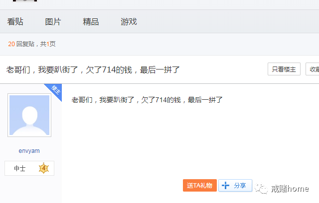 第一次赌,我输了27万,那段时间下定决心去戒赌,每天无所事事在网上看帖子,无意之中进了一个戒吧,它并不是百度贴吧,而是一些代理为了拉拢玩家所开发的论坛,它的界面与曾经戒赌吧基本一样。相信老哥们都知道,戒赌之后的一些时间里真的很无聊,就想找个地方去倾诉发泄,顺便再看看其他兄弟的一些悲惨事故,可是进了戒吧以后,我才发现那里根本不是讨论如何去戒赌,大家说的最多话题就是怎么样补天,我也因为所谓的补天,进行了二次复赌,现在欠下的负债有60万之多。