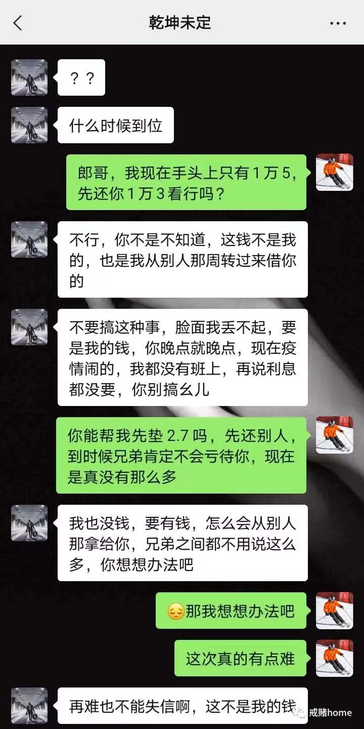 朋友那4万没有还,连身上的15000都进去了,我翻着通讯录,到处找可以借到钱的人,那么多亲戚当中,就只有堂姐没有借过钱,早些年,因为家庭琐事,我们家跟他们家闹翻了,所以我从没开口跟她借过。跟她打了个电话,简单聊了几句,就开始诉苦了,说打牌输了2万回家要离婚,虽然两个家庭不和,但堂姐跟我并没有因为那件事闹矛盾,后来还是顺利的借到了2万,期限是两个月内还给她。当时拿到这笔钱的时候,我是真的后悔,如果我不赌,身上的钱,加上堂姐的钱,再稍微借点,也能够把这个债务还掉,说再多也晚了,输都已经输了,我依然没办法,只能继续赌,那时候我只想把输的钱赢回来。