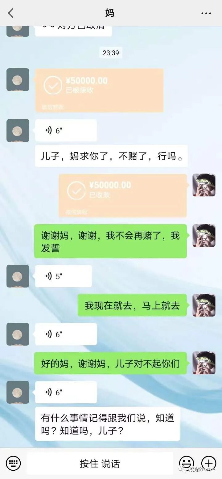赌了几年,表面看起来是跟正常人没区别,实际那些巨大的压力都是父母给我扛了,如果这次不是父母的帮忙,万一出了点什么事情,那么我这辈子都会遭受良心谴责。赌跟生命比起来不值一提,通过这事以后,我也想到了万一自己的父母哪天也这样,又该怎么办?我又该求着谁呢,所以我对天发誓了,今后再难也不会赌,家人真的比任何事都重要。老人为了我,已经毁了他们一生心血,结婚,买房,还债,他们就没有过上一天好日子,到今天还在为我还债,我妈做点小生意,菜市场卖菜,每天赚着微博的收入,我父亲是小区保安,每个月也才四千块不到,自己随便输一把,都是他们一个月的工资。