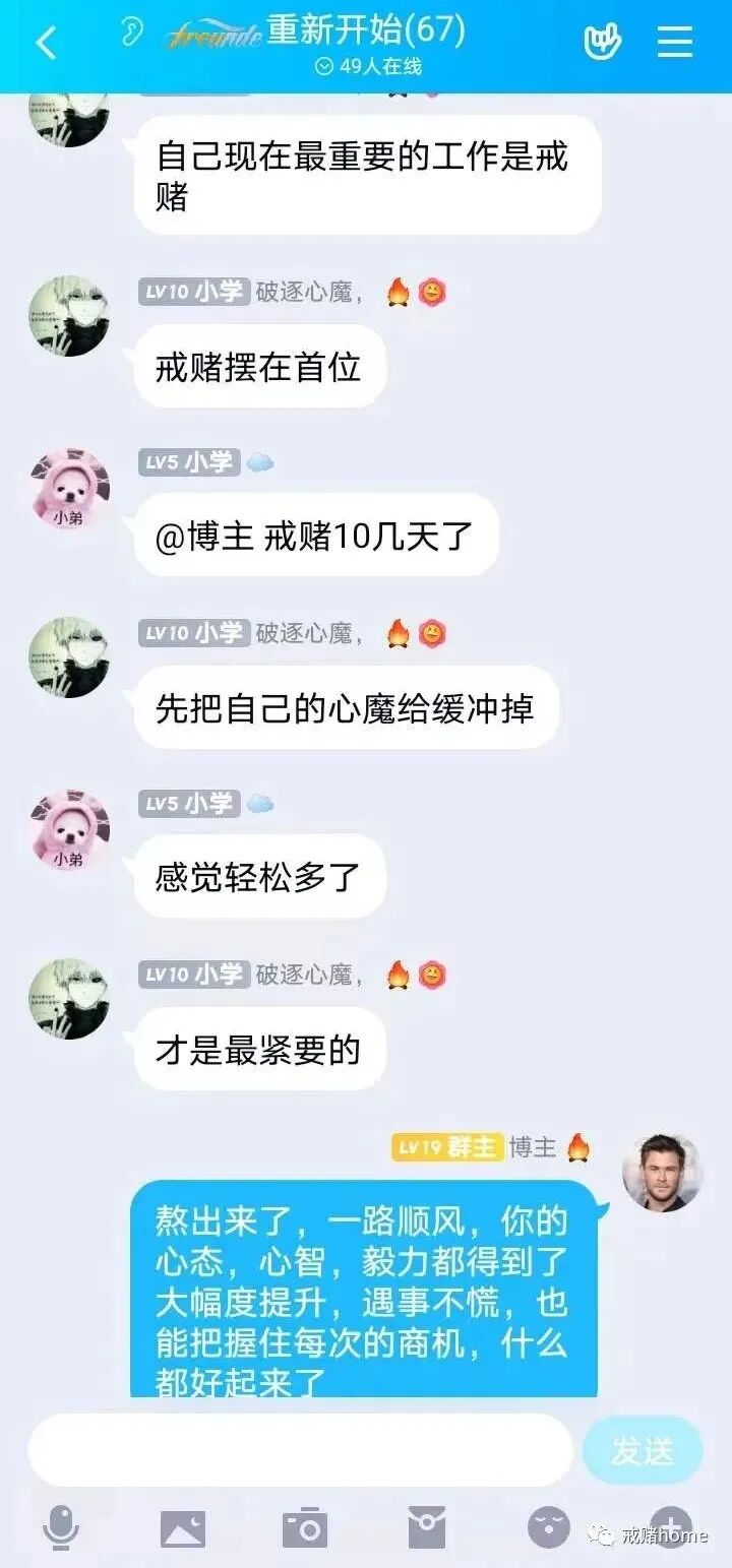 自律性不高的人,可以看别人发言,或者在群里说出自己的经历,有经验的人会第一时间为你提供解决方案,提供开导,以及过来人的经验。通过聊天,缓解赌徒内心的孤独,大大的转移自己的注意力,配合打卡签到,对戒赌能起到一定的作用。如果你感觉戒赌困难,或者工作不忙,休闲时间较多容易复赌,就可以考虑加群,接受正能量的渲染。
