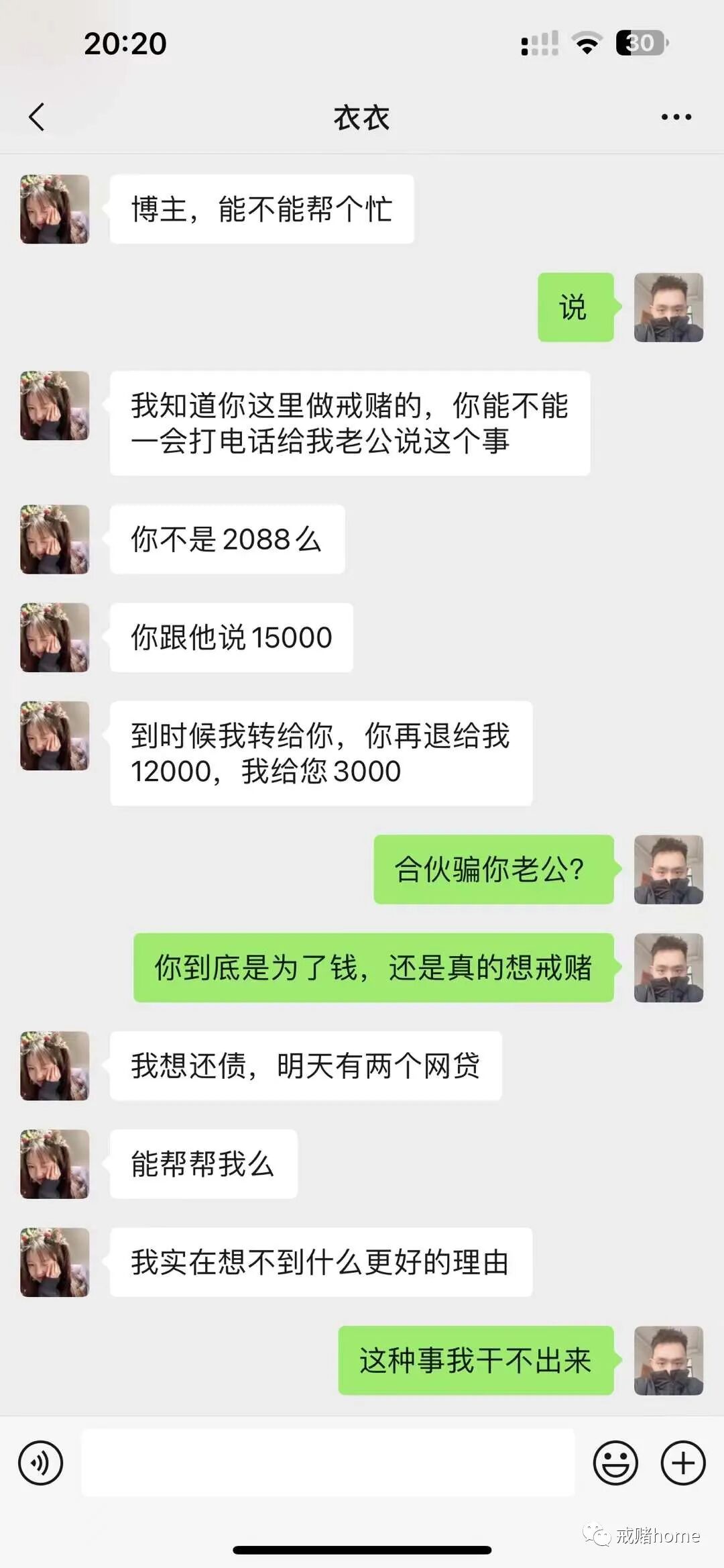病态系列:虽然咨询者说是为了还债,但我还想说,这是自欺欺人的借口,为了还债,就可以伙同外人,共同欺骗自己的亲人,这比诈骗犯更恶劣,诈骗犯都知道去诈骗外人,兔子还不吃窝边草,你却伙同外人,共同欺诈自己的亲人,还不惜付出几千块的利息作为交换条件。明眼人一看都知道,只是筹集赌资而已,并不是真的想戒赌,只是没有理由继续实施诈骗罢了。