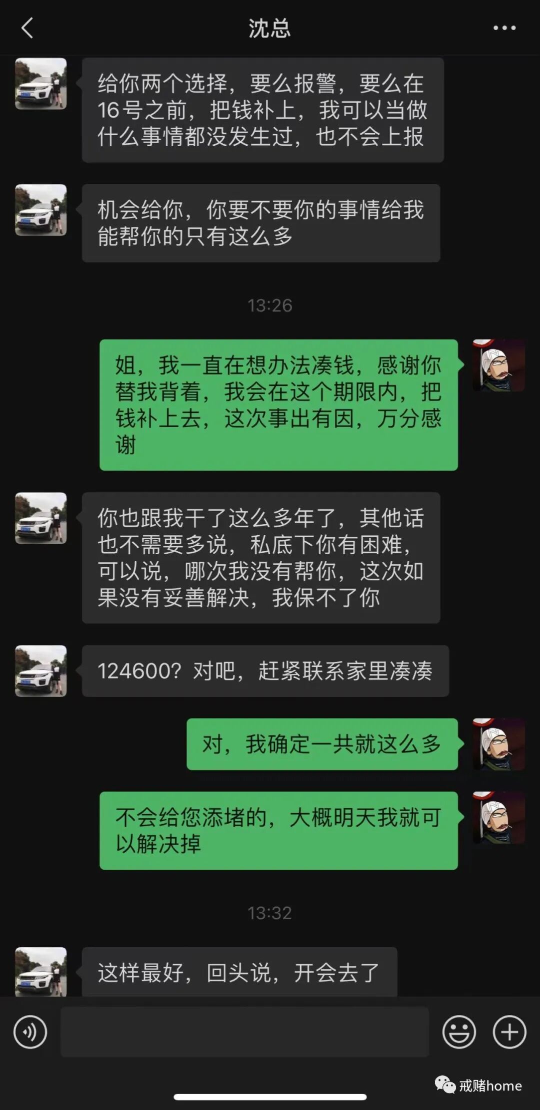 从没想过自己会变成这样,以前看到挪用公款的文章,我觉得那些人真胆大,没想到有一天我也跟他们一样,有点侥幸心理,赢点钱把债务补上,其余的钱把公款补上就能神不知鬼不觉,狗庄估计心里乐开了花。我想说,不会再有下一次了,是人输这么多都会清醒,我相信自己肯定可以做到。另外,我很清楚姐夫肯定会借我钱,我家就只有我姐跟我,我姐听父母话,如果她不帮我,我就让父母去说,也许你们觉得我真没救了,但没办法了,我肯定会还,而且利息我也会给,总比把利息给外人好,这一年下来,利息都要五六万,我会给姐姐他们写借款协议,这次认栽,下次谁劝我赌,我都会拉黑。