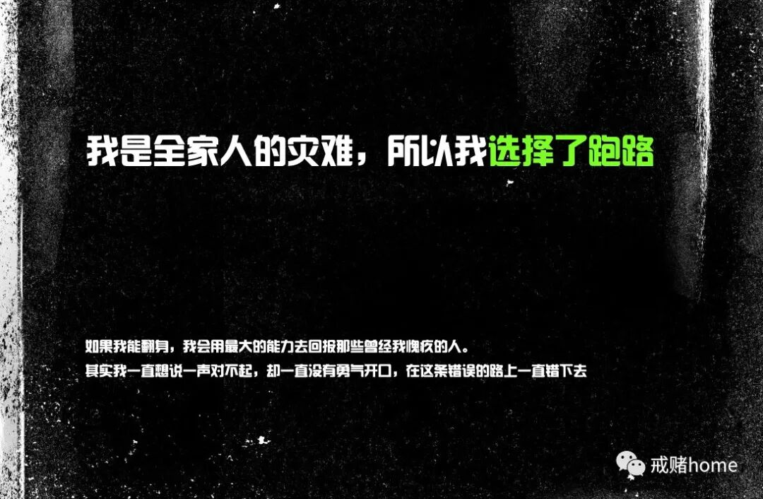 我浪费了最好的5年青春,23岁,到28岁,赌废了,家废了,自己欠了60万随时会被起诉,父母借了银行和亲戚,40多万,现在估计也没有活下去的信心吧。就在今天,我坐上了大巴,没有留下任何话选择了跑路,因为庞大的债务即将爆发,已经到了不跑不行的地步,或许只有跑路,才是对家人,和自己最好的交代,我对不起债主,对不起太多人,如果我能翻身,我会用最大的能力去回报那些曾经我愧疚的人。