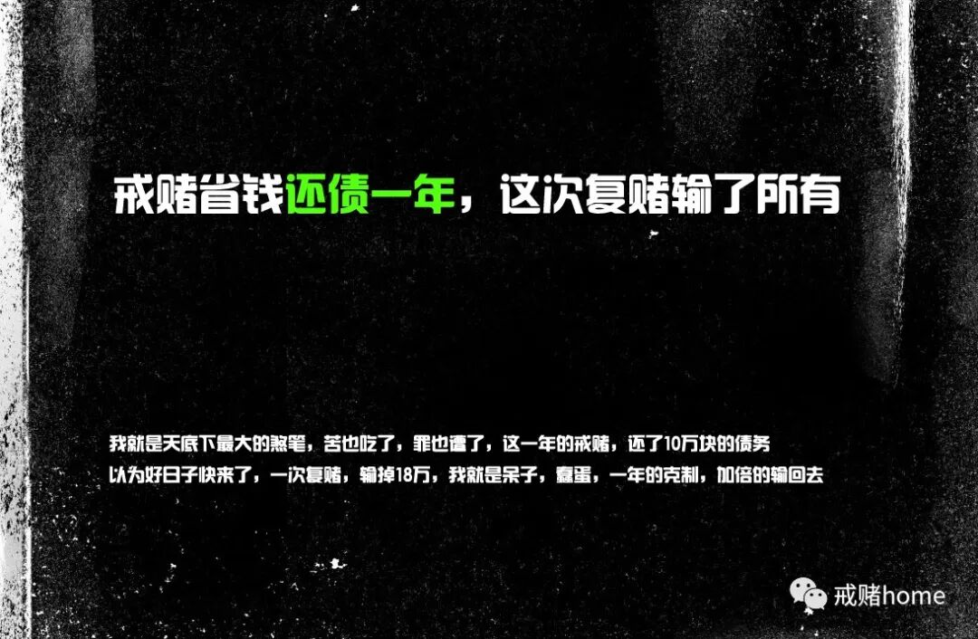 我就是天底下最大的煞笔,苦也吃了,罪也遭了,这一年的戒赌,还了10万块的债务,以为好日子快来了,一次复赌,输掉18万,我就是呆子,蠢蛋,一年的克制,加倍的输回去,我把脸都扇肿了,钱也不可能能回来,本想找个没人的地方结束生命,想到上有父母,下有孩子。