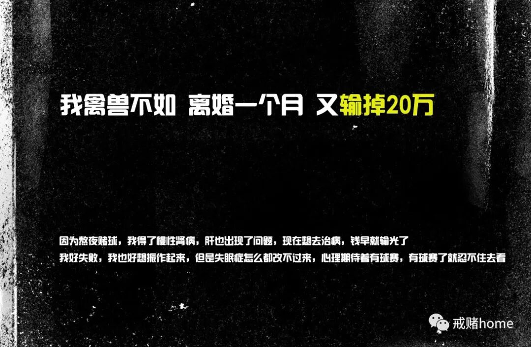前几天,欧冠比赛皇马对决利物浦,我把所有的家当都压在了利物浦,和大球上面,比赛90分钟,那90分钟,加上伤停补时也就110分钟,我抽了一包烟,基本上抽上几口我就扔了,又重新点燃一根香烟,甚至香烟拿反了都不知道,那场比赛,大球3万输了,利物浦2万也输了,最终的结果利物浦0-1皇马,我输掉了5万,当时气的想哭都哭不出来。看着房间挂着的一家三口合照,我多悔恨,我多想时光倒流回到过去,现在我成了这样的恶魔,孩子平板我舍不得买, 一场比赛5万毫不犹豫的就敢丢进去,原来我自己才是那么最自私自利的人。老婆平时网购,我总是说她乱花钱,虽然我自己平时也很少花钱,但是赌博才是最烧钱的,这么多年,我输了房子,存款,车,还有那么多对我信任的人,我好失败,我也好想振作起来,但是失眠症怎么都改不过来,心理期待着有球赛,有球赛了就忍不住去看,从没有一件事让我这么上瘾,赌球让我觉得比吸毒很要厉害。