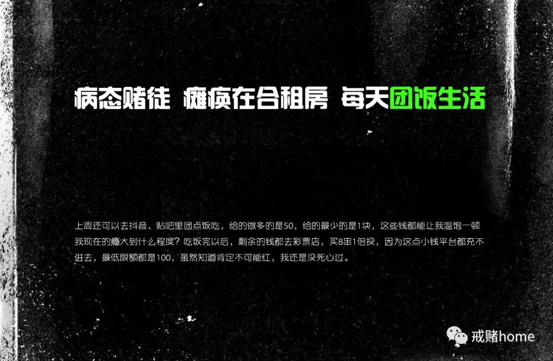 上周还可以去抖音、贴吧里团点饭吃,给的做多的是50,给的最少的是1块,这些钱,都能让我温饱一顿,我现在的瘾大到什么程度?吃饭完以后,剩余的钱都去彩票店,买8串1倍投,因为这点小钱平台都充不进去,最低限额都是100,虽然知道肯定不可能红,我还是没死心过。
