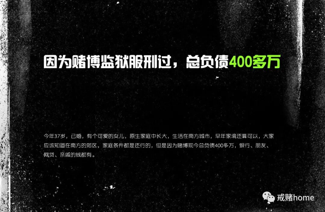 今年37岁,已婚,有个可爱的女儿,原生家庭中长大,生活在南方城市,早年家境还算可以,大家应该知道在南方的郊区,家庭条件都是还行的,但是因为赌博现今总负债400多万,银行、朋友、网贷、亲戚的钱都有。
