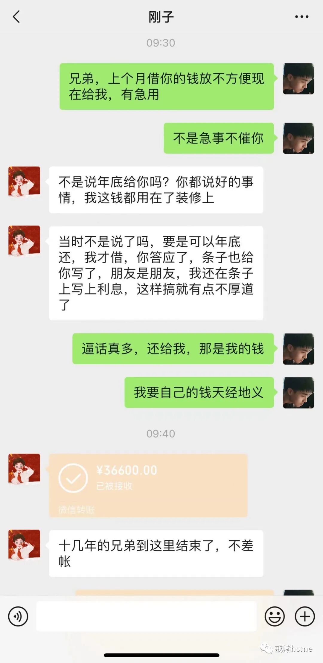 最好的兄弟,曾经我第一次坦白之前,跟他借过5万,后来也半年多才还给他,因为戒赌了,半年都没赌,手里有点积蓄,上个月他进屋要装修,我借给他36000,还发了600块的红包恭喜他乔迁之喜。赌狗上头,什么亲人朋友,都可以立刻翻脸,说要就要,欠我的就立刻要,不给我那就把话说的很难听,我虽然要回了钱,但也输了,而且今天我失去了最好的朋友,现在后悔了,打电话拉黑了,微信,支付宝都拉黑了。