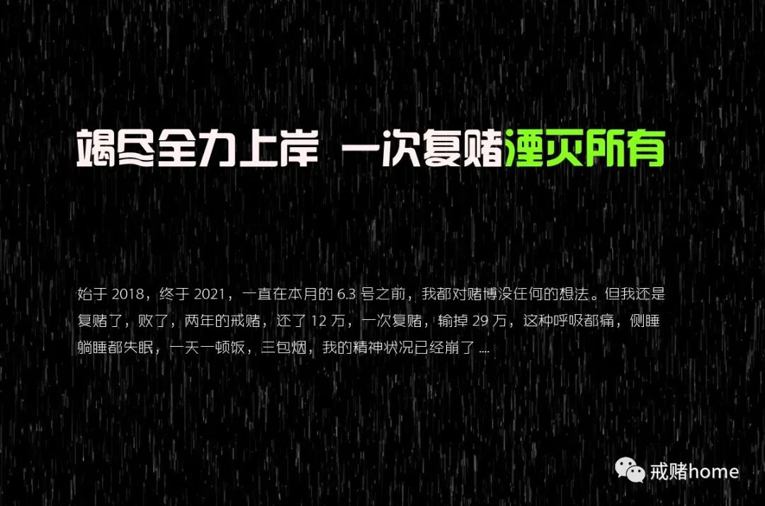 始于2018,终于2021,一直在本月的6.3号之前,我都对赌博没任何的想法。但我还是复赌了,败了,两年的戒赌,还了12万,一次复赌,输掉29万,这种呼吸都痛,侧睡躺睡都失眠,一天一顿饭,三包烟,我的精神状况已经崩了,孩子孩子没照顾好,下学期的学费都成了问题,老婆在家发了疯的砸东西,要离婚,我真的是个畜生,我老婆说我不如狗,我为什么不去跳楼,不去死啊,我现在做什么都是错的,我该何去何从。
