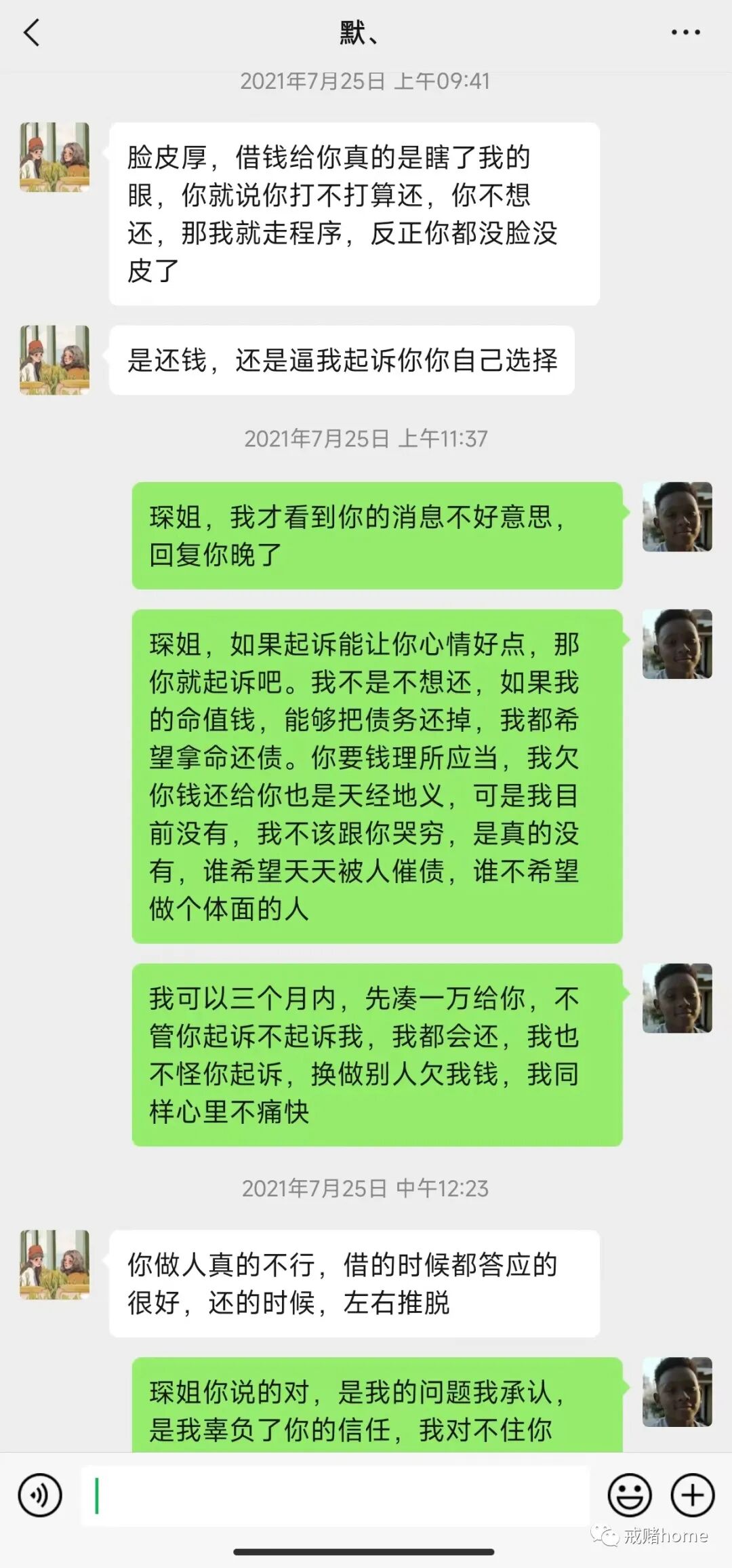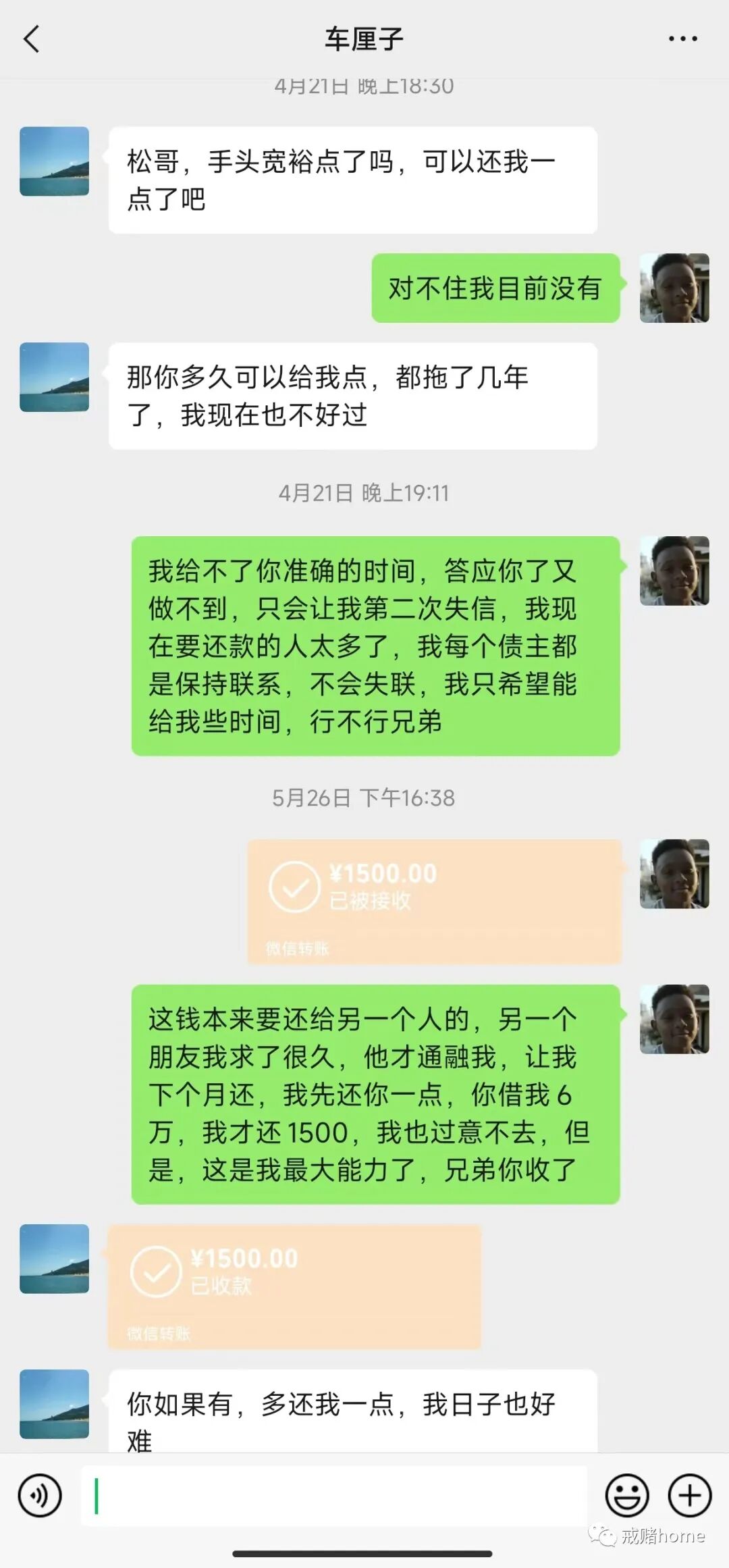 当初能借到钱,借到很多的钱,还感觉到一丝开心,多么变态的心理,如今看来,当初借了那么多钱,差点是要了我的命。借钱时,各种借口随口而来,以为赢了就可以还上,我一次次的透支朋友对我的信任,我把信任当成了翻身的资本,却陷入了万劫不复,而现在,每次面临这种催收难题时,不管我多么不想面对,我都会面对,我欠了的不只是钱,而是别人对我的情谊,不管说话是否难听,我都会迎合,错再我,我才是那个该下油锅的人,别人也需要生活,也有家庭,所以,200万的债务,这一辈子还不清,我也要尽力去还清,我不想死了,都要带着愧疚去,我更不想被自己的女儿看不起,爸爸是个老赖。