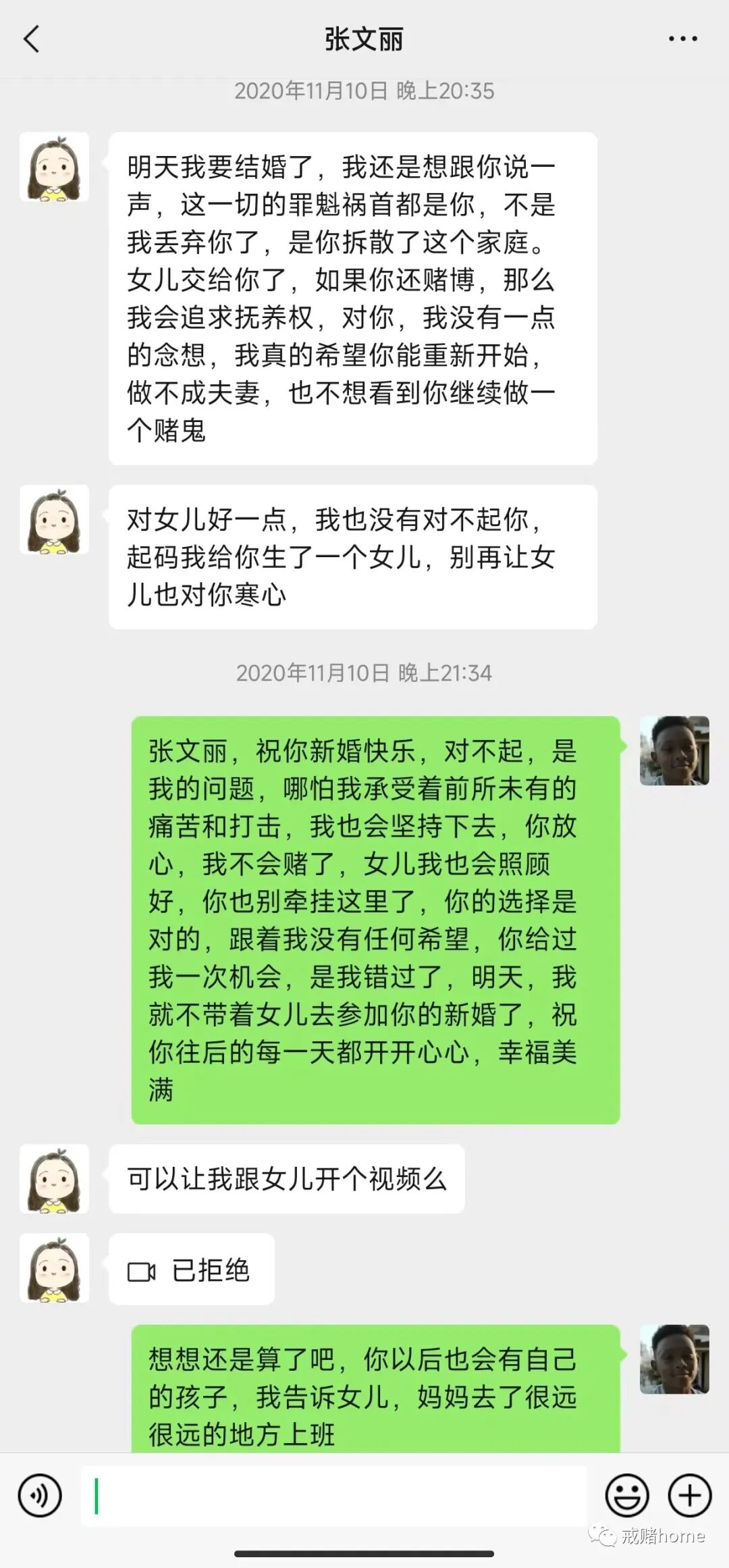 前妻的再婚,当时差点人就没崩住,想不开了,但是看着乖巧的女儿,我还是都忍住了。她说都一点也没错,如果我是一个正常的人,也肯定拥有幸福的婚姻,一切都是因为我自己赌博,不顾家,给不了她生活下去的希望,千错万错都是我的错,所以我更应该好好活着。没有哪个男人,愿意看到自己都老婆跟别人结婚吧,这种痛苦,哪个人都承受不了,直到现在,我才接受了这个事实,痛苦了这么多年,每当自己孤独时候,想想我爱的人,已经跟别人在睡梦中里,都会有挫骨扬灰都痛。朋友们,如果你们结婚了,千万要珍惜婚姻,赌博花点时间能戒掉,但婚姻离了,就不一定能复合了,最受伤害的无非是自己的孩子,每当孩子想妈妈了,我都没办法解释,这种痛楚,我不希望大家去体验。