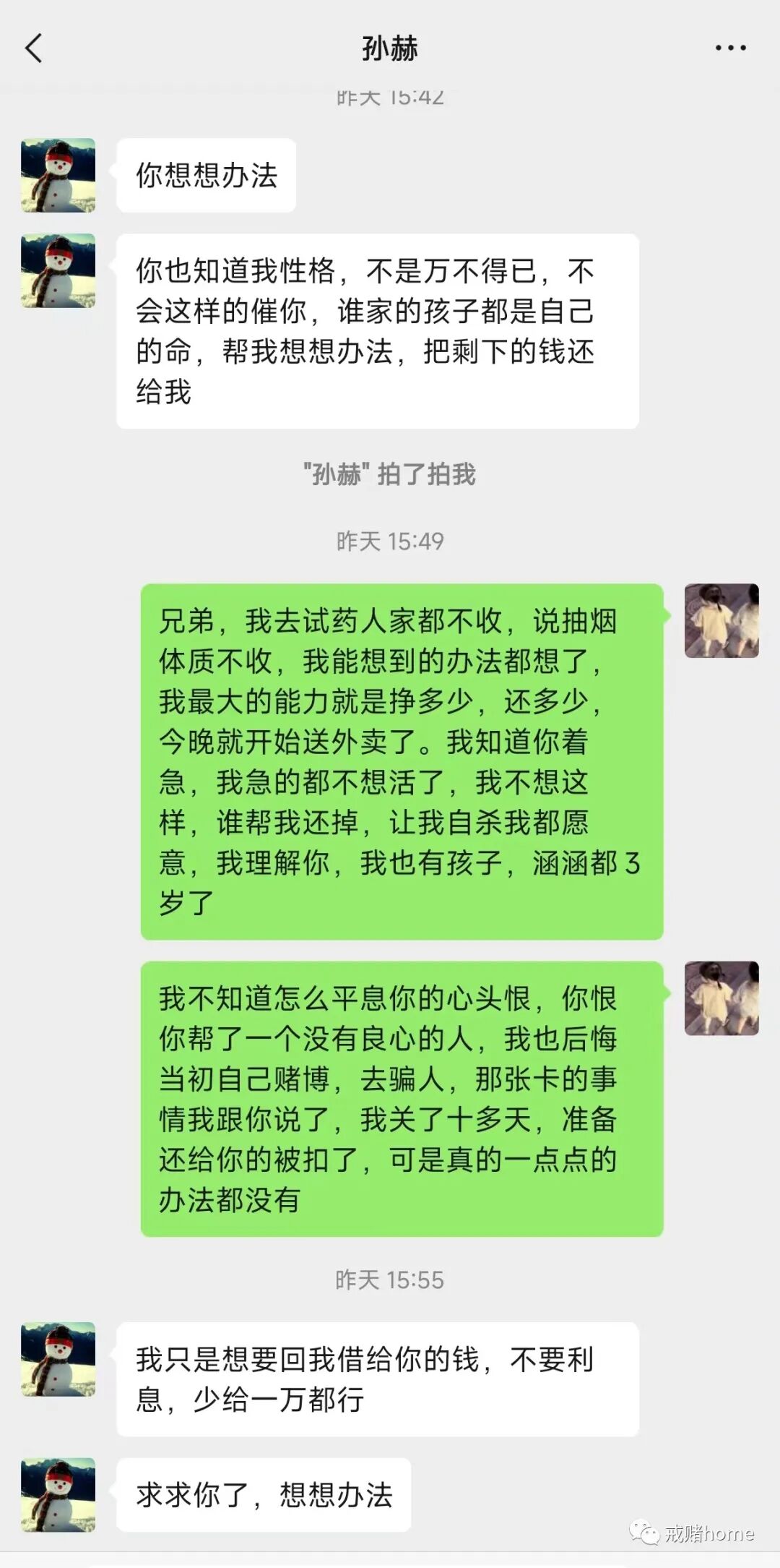 昨天进群的时候我身上30块,交了28的群费,还剩2块钱,后来又退给我了,我买不起烟,就捡烟头,外面到处都是烟头,我也习惯了晴天的时候多捡点,下雨天是捡不到的,我的工作目前就是外卖,邻居家的儿子也是送外卖的,他白天送,我晚上哄了孩子睡觉后才去送,因为我只能借他的电动车,自己买不起新的电动车,也用他的美团账户跑,多少钱他会直接转给我,我不能自己注册,因为我的银行卡都被冻结了,提现都提不到,这就是赌博给我的生活造成了这么大的影响。想过死,昨天下午感觉很强烈,我不想对不起自己的朋友,他儿子白血病,整个家都瘫痪了,找我要钱我却没有,比心被挖了还要痛苦,我太想还给他了,我把每天的生活费控制在30,让孩子补充营养,如果没有离婚,没有赌博,我想孩子应该还可以喝着牛奶吧,都被我毁掉了。