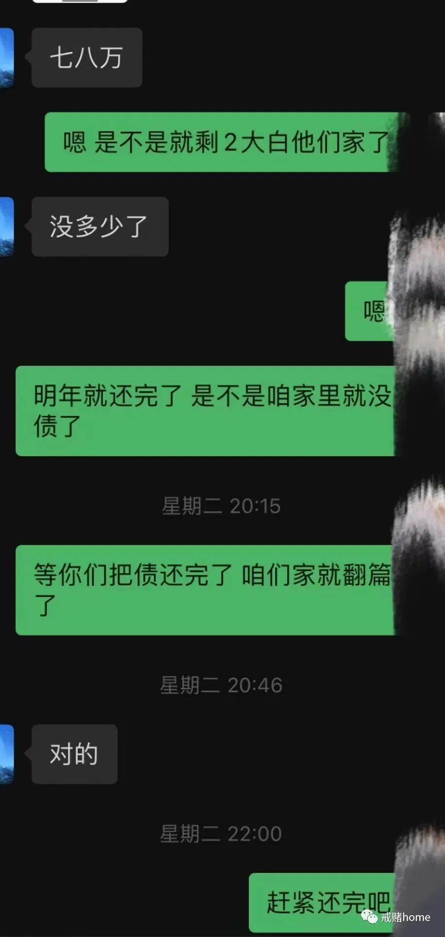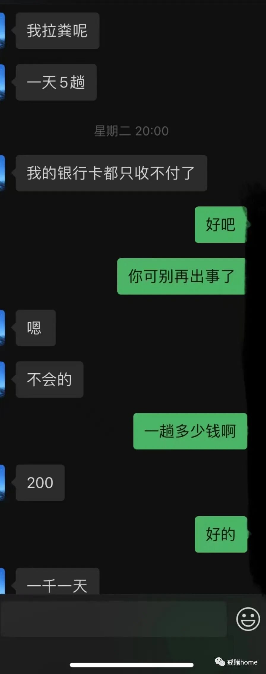 有些哥子抱怨为什么家人朋友要催自己还钱,不催的话,自己就不至于重新去赌。看到哥子们给自己找借口扭曲地三观后,我甚至会想笑。因为借给你们钱的人又有什么错呢?哪怕借给你们一块两块都是别人风里雨里赚来的,别人不欠你们的。所以,被抱怨被指责是你们应该承受的精神代价,被催款是你们必须面对的心理折磨。