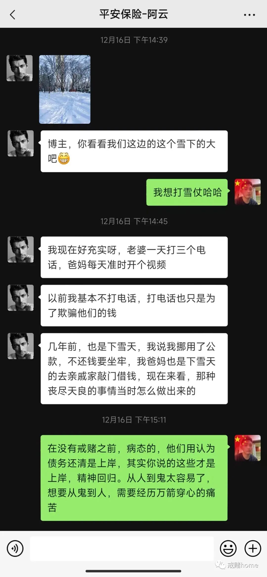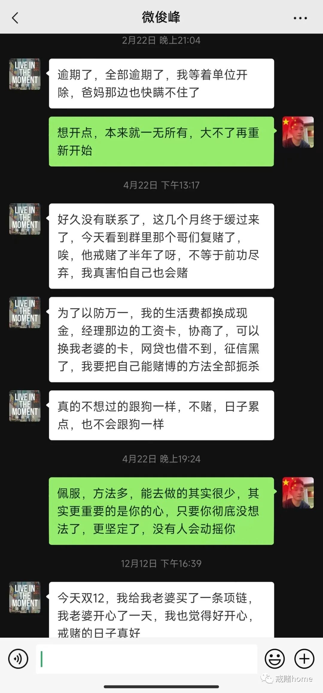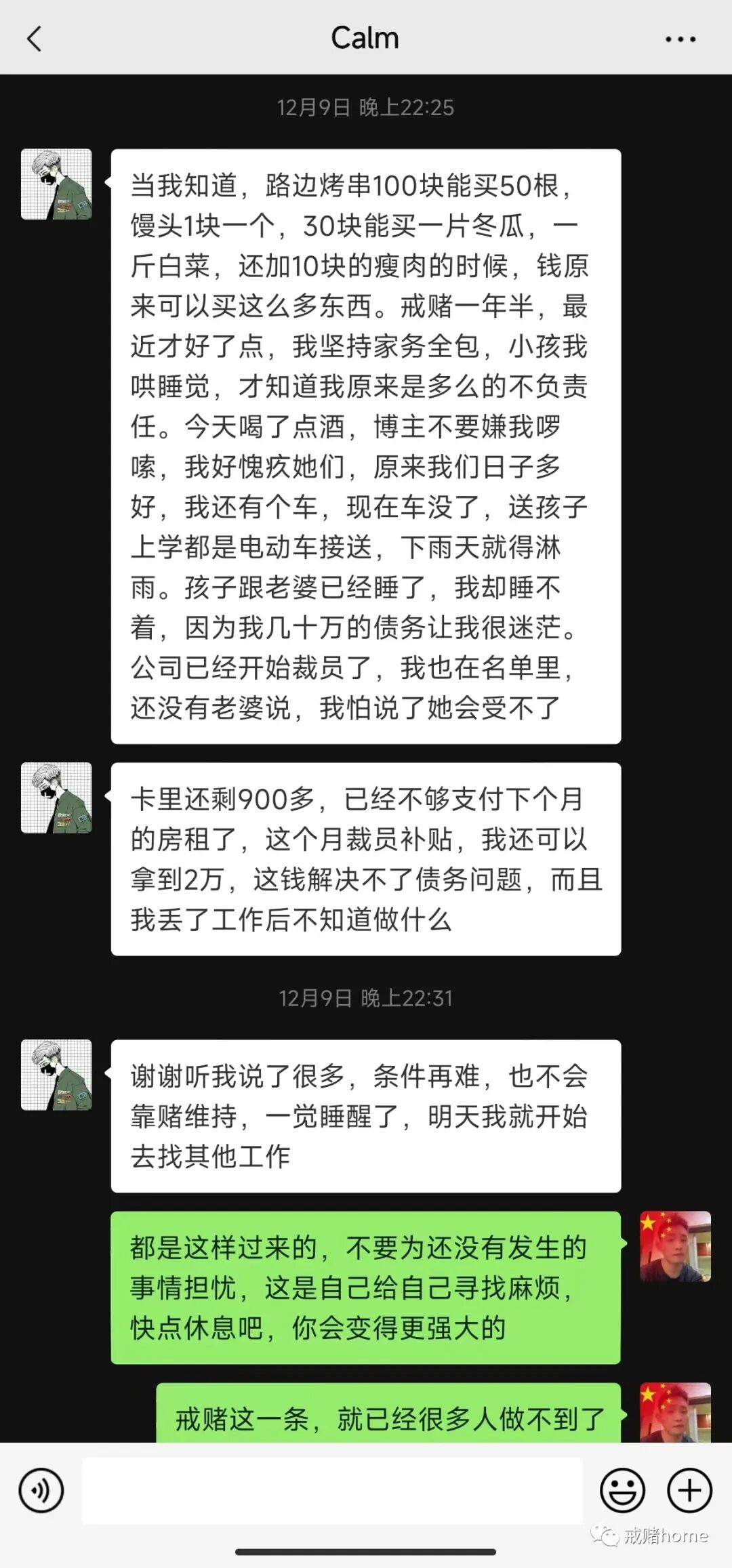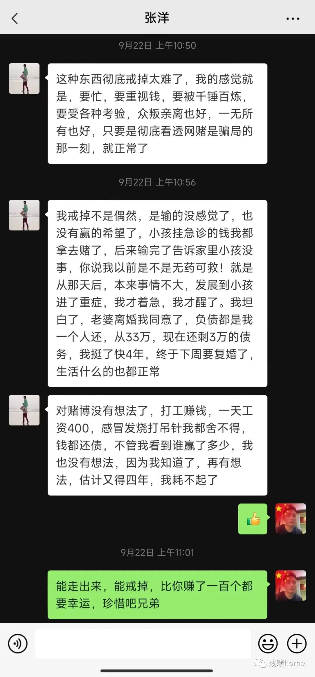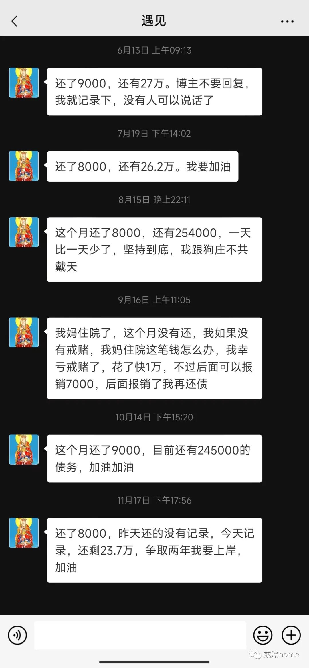 一句老话重复再说,不要把债务当成戒赌的成功秘诀,债务是因果,戒赌是根治,赌鬼就是从人到鬼,要是从鬼到人,那么你才算成功;债务就跟钱包漏了一样,装多少漏多少,装了又补,补了又漏,始终存不到钱;而从人到鬼,就是恢复你的生机,恢复你的兴趣。