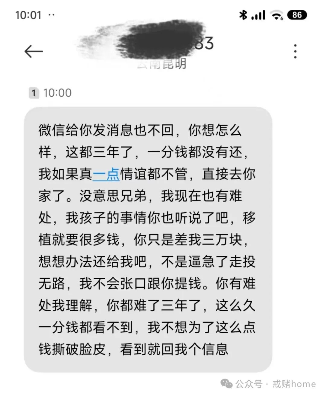 今年过年,我不知道跟几个人借过钱,都没借到,因为网贷催收,让所有人都误认为我做了什么违法的事情,我只是想借三万,把兄弟的那笔钱还上,就算他不给我发信息,我也知道他的困难,他能挺到现在才找我,已经是够意思了,如果换做我,未必能等三年这么久。老婆有能力帮我借一笔钱,可以还紧急的债,但是这样做也是杯水车薪,没有任何意义,她要考虑孩子的前途,她也要考虑自己的未来,这些我统统都理解,我现在除了这条命,我不知道自己还有什么价值去偿还这么多的债务,当时赌博的时候,输完可钱才舒服,那可是几千几万啊,我要是早一个月戒赌,我都能还掉不少债务。