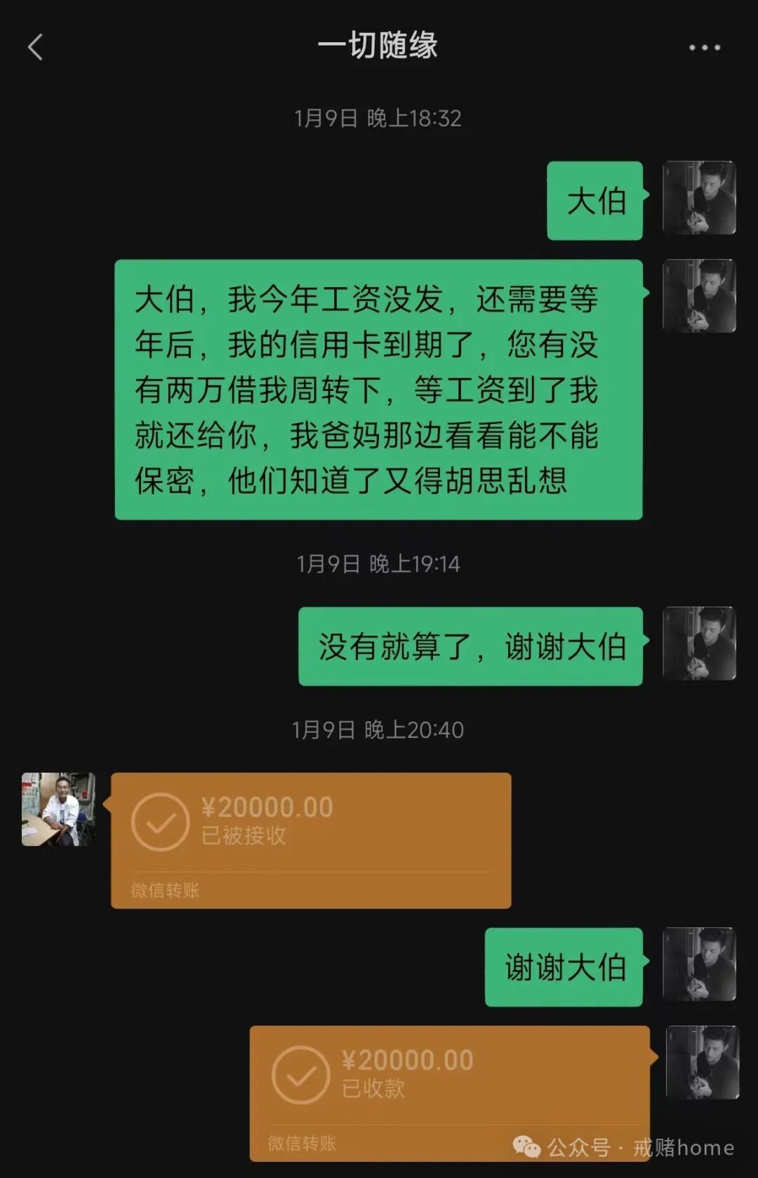 大伯是老实本分的诊所医生,自从赌博之后,我先天性的就养成了特殊技能,能很清楚谁的钱比较好借。说借都是委婉了,应该是谁的钱比较好骗。我大伯去年借的5万都还没还呢,可能碍于情面,他又不得不借,他一生都看重面子,我又喜欢演戏,虚的东西使劲整,过年拜年就属他家送的礼多,人活一张皮,别人是为了搞好关系,我是为了搞钱,搞到的钱你以为是还债吗?错了,是为了赌,不管外面催的多狠,别人的钱多着急,别人就是在医院里抢救,我有钱都不还,宁愿博一吧。兄弟们,我真的很难受,也不怕被人骂,我实在是难受的不行了。