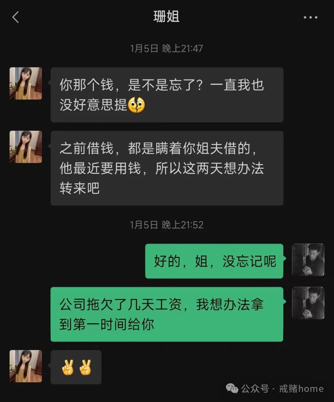 借钱是孙子,还钱的时候开始着急了。每次都是奔着借钱还债的,结果每次钱借来后,我又不想还了,把债还了我没钱赌了。我只是差这个表姐1万块啊,而后面我借来了两万块,我都舍不得还,我真的是畜生!人家的钱就不是钱吗?我输完我才知道还钱,我每次输完都很后悔为什么我就是不还债?你们知道吗?我把自己折磨的遍体鳞伤,输的不仅仅是钱,输的还有内心的反复折磨,还有自残倾向,我的一个小拇指就被我折断了,无法恢复,尽管这样,我仍然还是戒不掉,真的戒不掉啊。