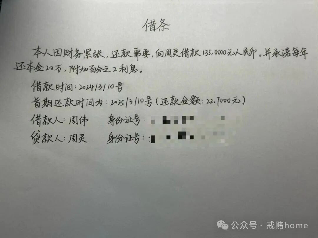 我给我姐,打了一张借条,亲情归亲情,不能因为借钱的事情,让我姐的家庭鸡飞狗跳,我明白我姐夫对我失望透顶,换做任何人都会失望,更何况这是我第三次坦白,所以我会用时间跟他们证明,我肯定会戒,也肯定会好,每年归还20万的同时,还会给两个点的利息。从今以后,好好工作,不管是体育彩票,还是网络,都发自内心地戒掉。
