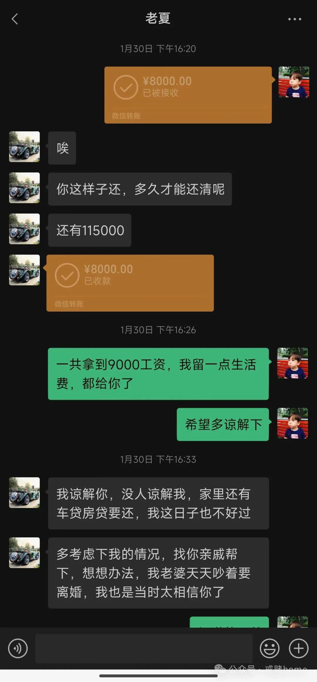 我为什么戒赌?最后一次我告诉家人负债175万的时候,我妈听后半天说不出话来,然后过了10多分钟,吐出来很多血,那一刻的画面,到今天还在我心中徘徊,所以我不能继续了。这一次吐血,下一次可能直接原地去世了。我这几个月,一边工作一边反思,其实对工作赚多少钱,是没感觉的,它没办法跟我以前的收入所媲美,我工作,是不想让自己成天内耗,几个月才还款15000,这点钱等同于我债务的零头罢了。我心情沉闷,收入上的天差地别,地位上的巨大落差,让我每天都过得很痛苦。经常看到一些投稿人,负债十多万就已经不想活了,如果我也是那种心态,我也不知道自杀多少回了。